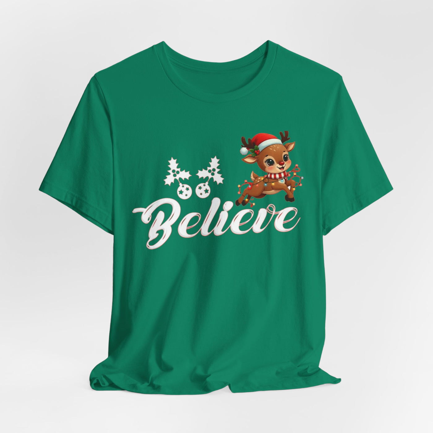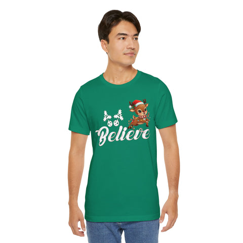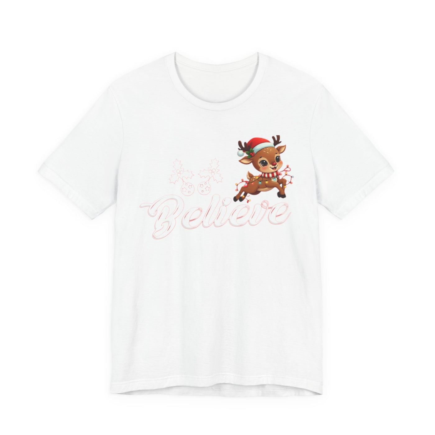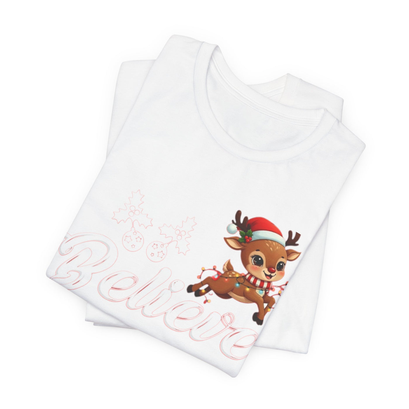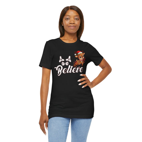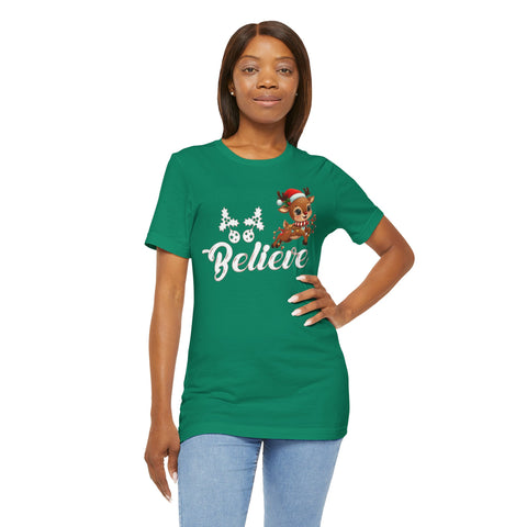 Soft, lightweight cotton meets holiday whimsy. This jersey tee carries a playful reindeer in a Santa hat and the script “Believe,” printed with crisp, detailed techniques that keep the colors bright and the lines clean. It drapes easily for layering under sweaters or wearing alone during festive gatherings. The breathable Airlume combed cotton feel keeps you comfortable through chilly lights-out walks and busy kitchen prep. Thoughtful construction—side seams, shoulder tape and a ribbed collar—means it keeps its shape wash after wash, while the tear-away label prevents itchiness. Wear it to cozy movie nights, tree-decorating sessions, or casual holiday brunches to add a gentle, nostalgic touch to the season.