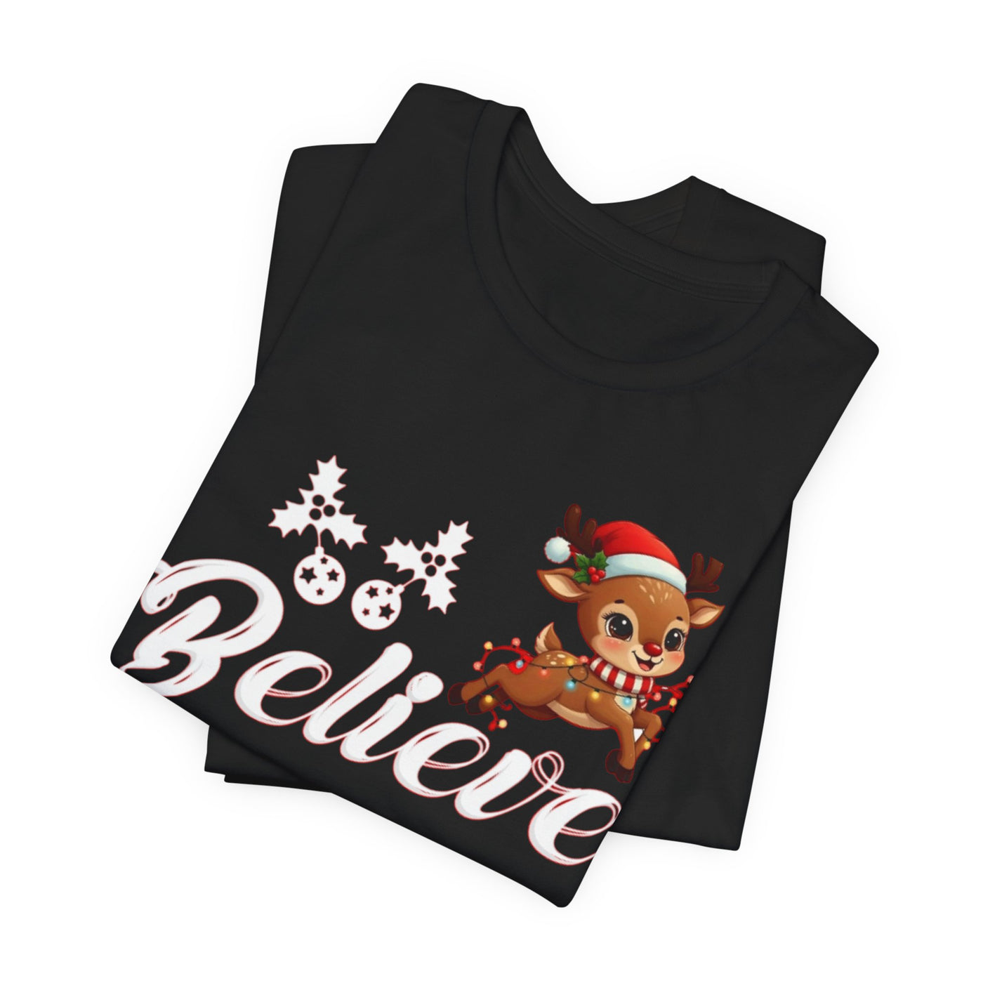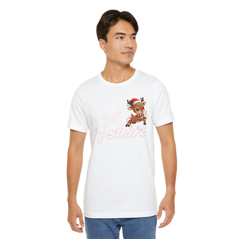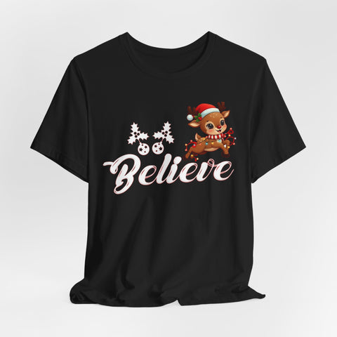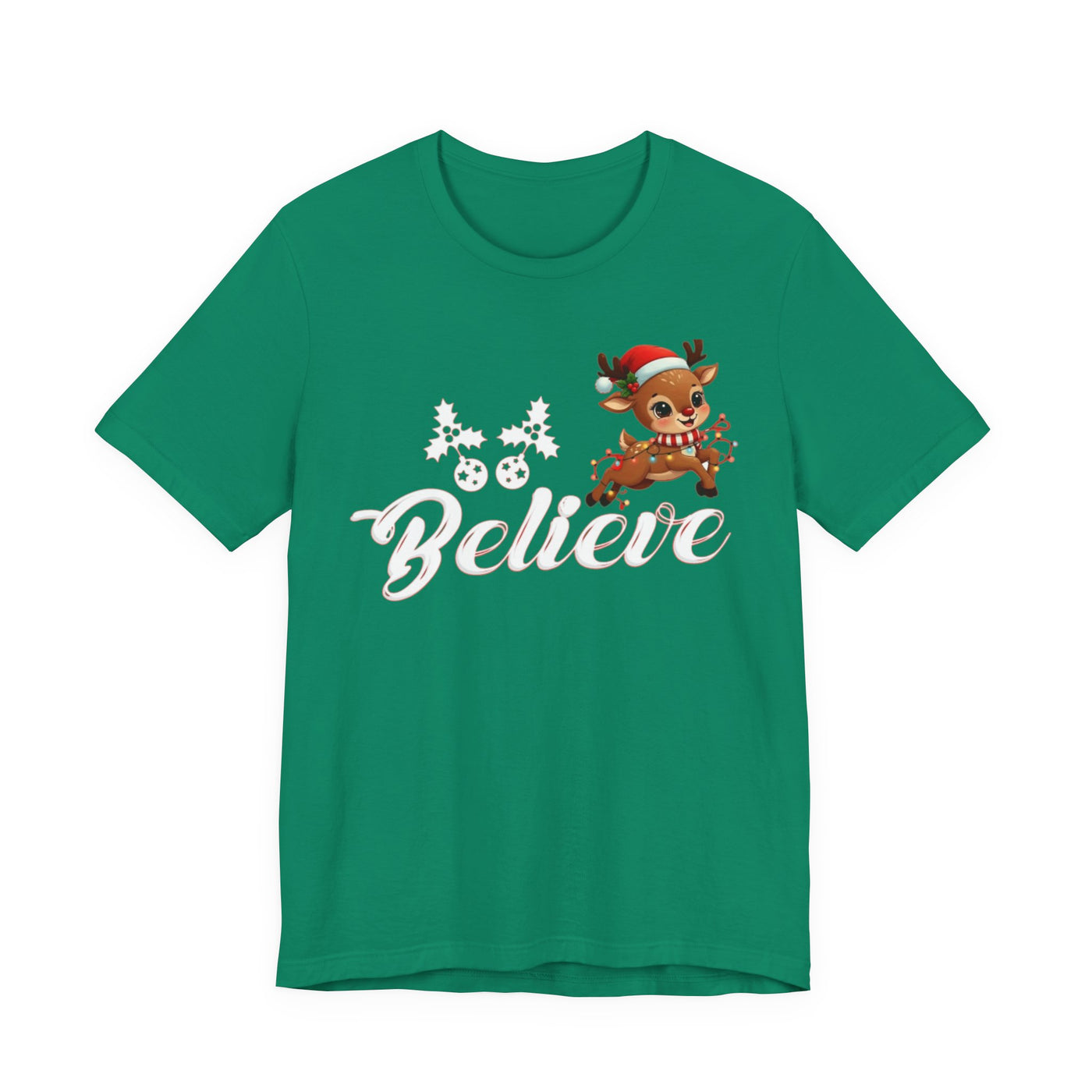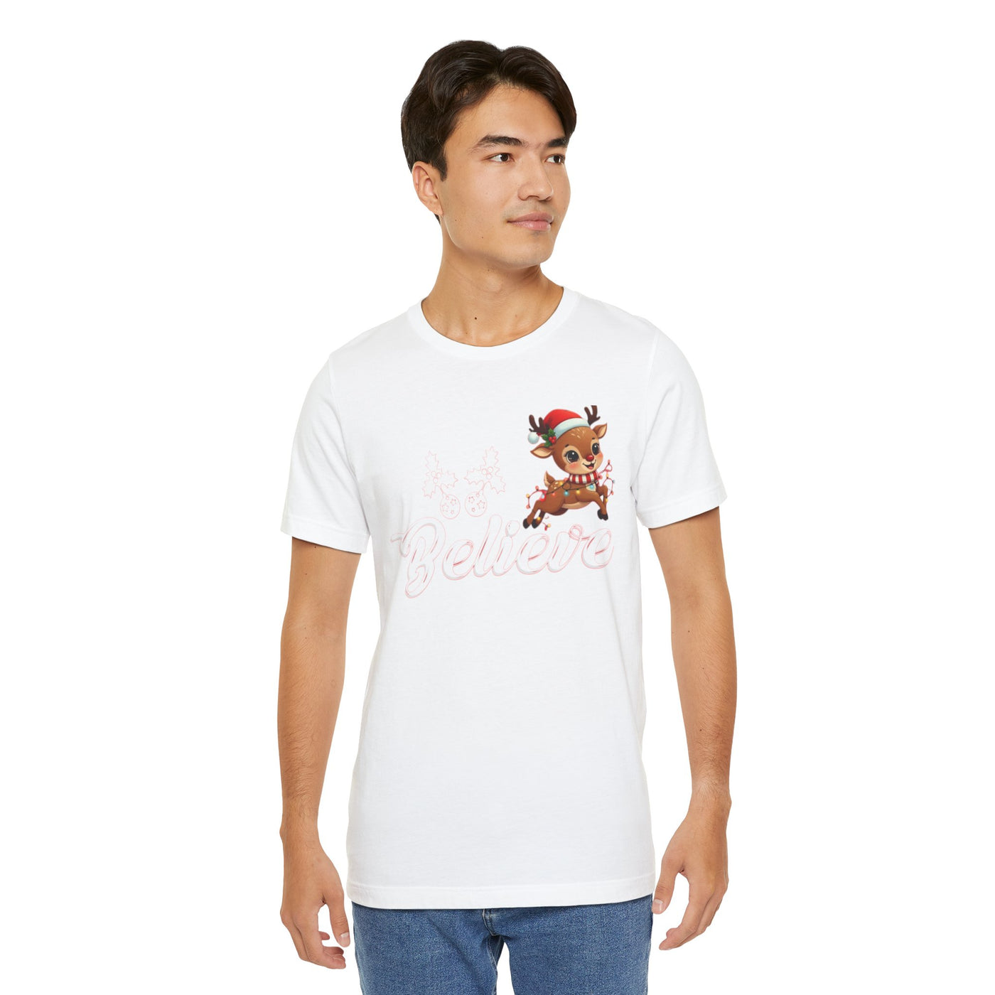 Soft, lightweight cotton meets holiday whimsy. This jersey tee carries a playful reindeer in a Santa hat and the script “Believe,” printed with crisp, detailed techniques that keep the colors bright and the lines clean. It drapes easily for layering under sweaters or wearing alone during festive gatherings. The breathable Airlume combed cotton feel keeps you comfortable through chilly lights-out walks and busy kitchen prep. Thoughtful construction—side seams, shoulder tape and a ribbed collar—means it keeps its shape wash after wash, while the tear-away label prevents itchiness. Wear it to cozy movie nights, tree-decorating sessions, or casual holiday brunches to add a gentle, nostalgic touch to the season.