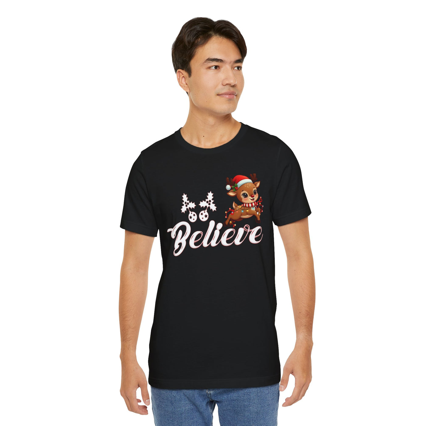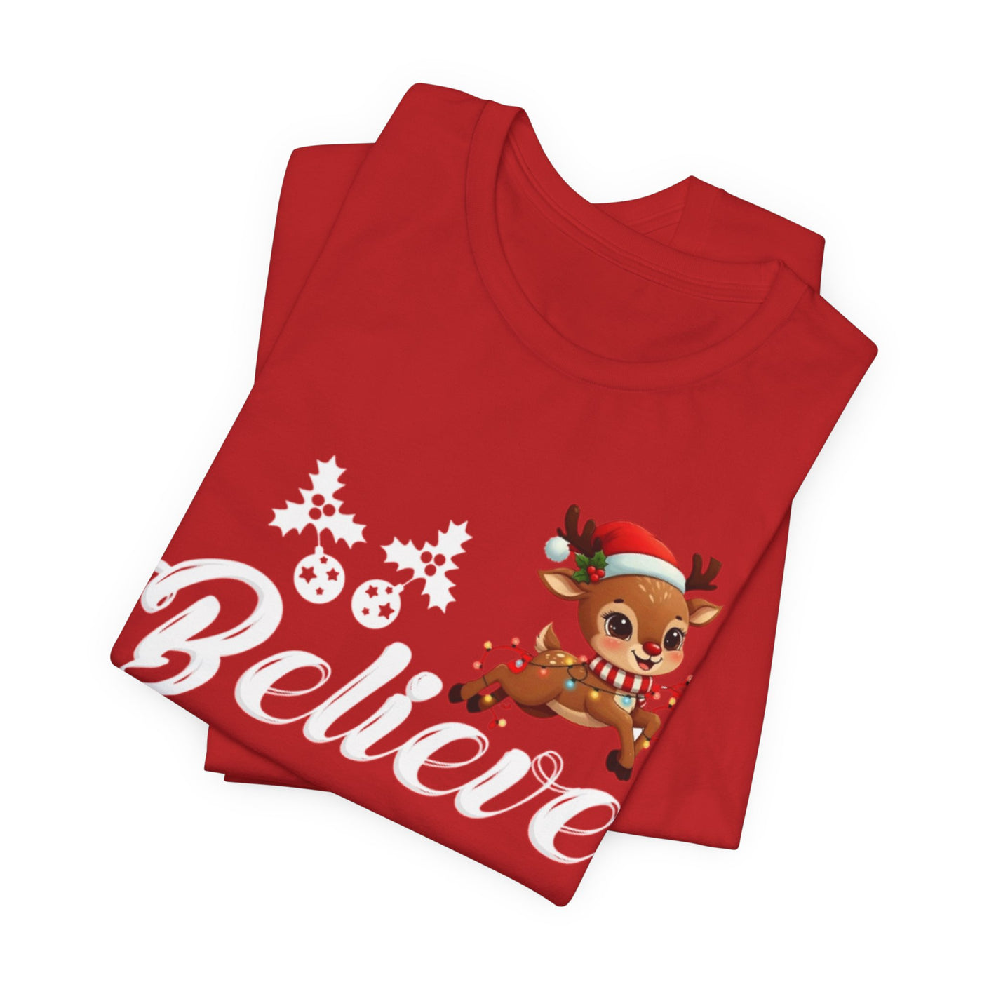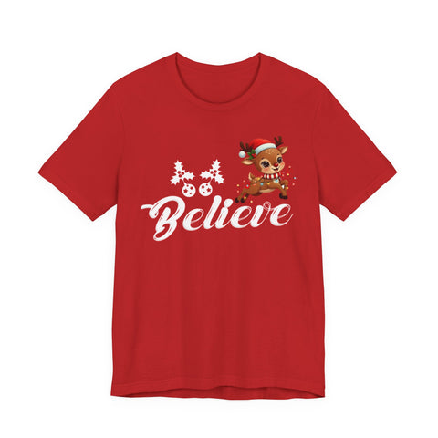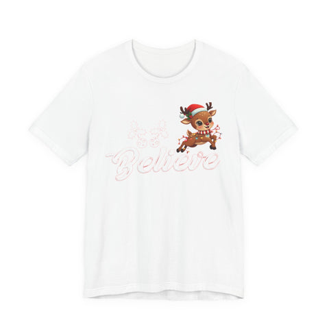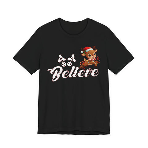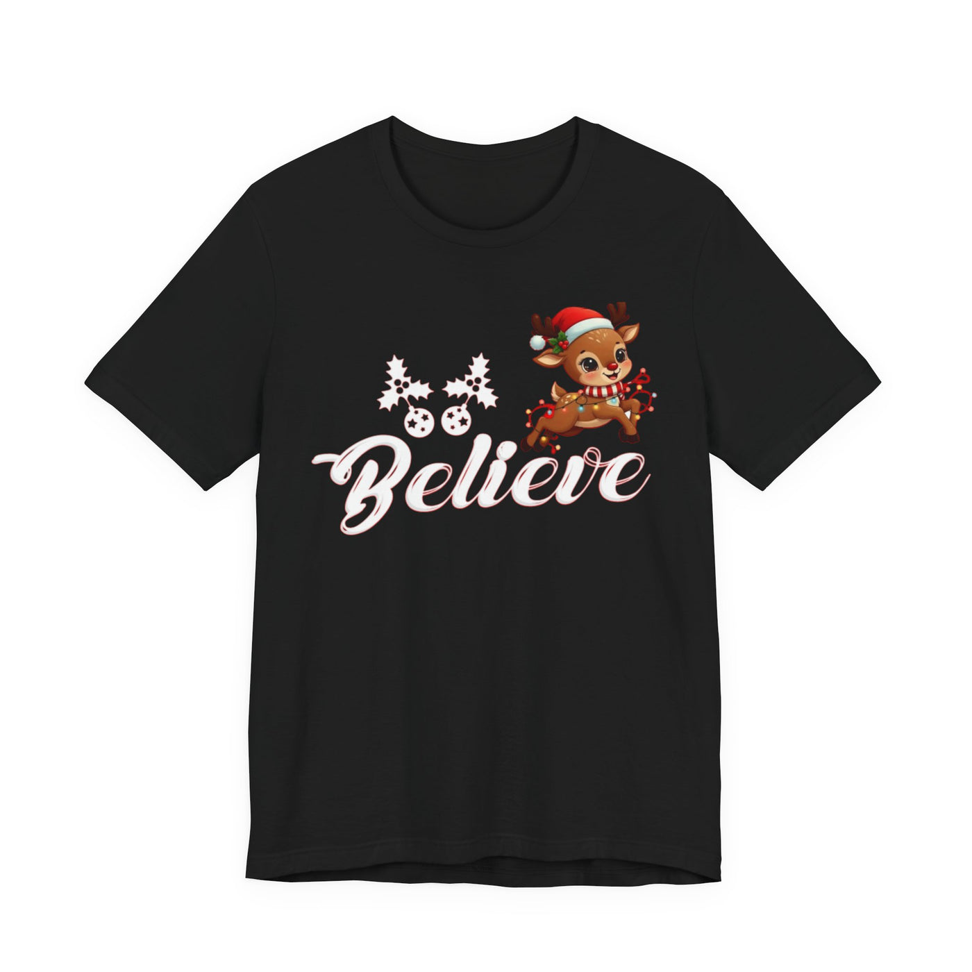 Soft, lightweight cotton meets holiday whimsy. This jersey tee carries a playful reindeer in a Santa hat and the script “Believe,” printed with crisp, detailed techniques that keep the colors bright and the lines clean. It drapes easily for layering under sweaters or wearing alone during festive gatherings. The breathable Airlume combed cotton feel keeps you comfortable through chilly lights-out walks and busy kitchen prep. Thoughtful construction—side seams, shoulder tape and a ribbed collar—means it keeps its shape wash after wash, while the tear-away label prevents itchiness. Wear it to cozy movie nights, tree-decorating sessions, or casual holiday brunches to add a gentle, nostalgic touch to the season.