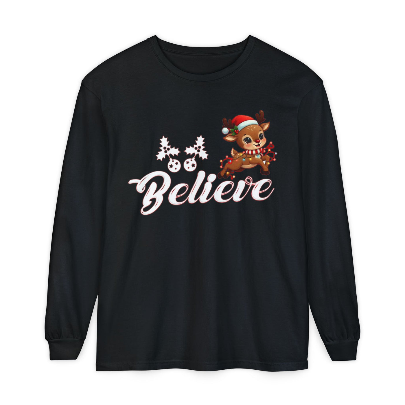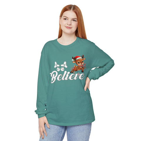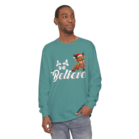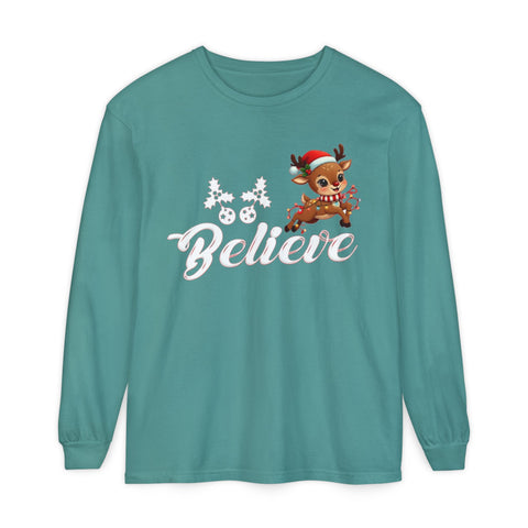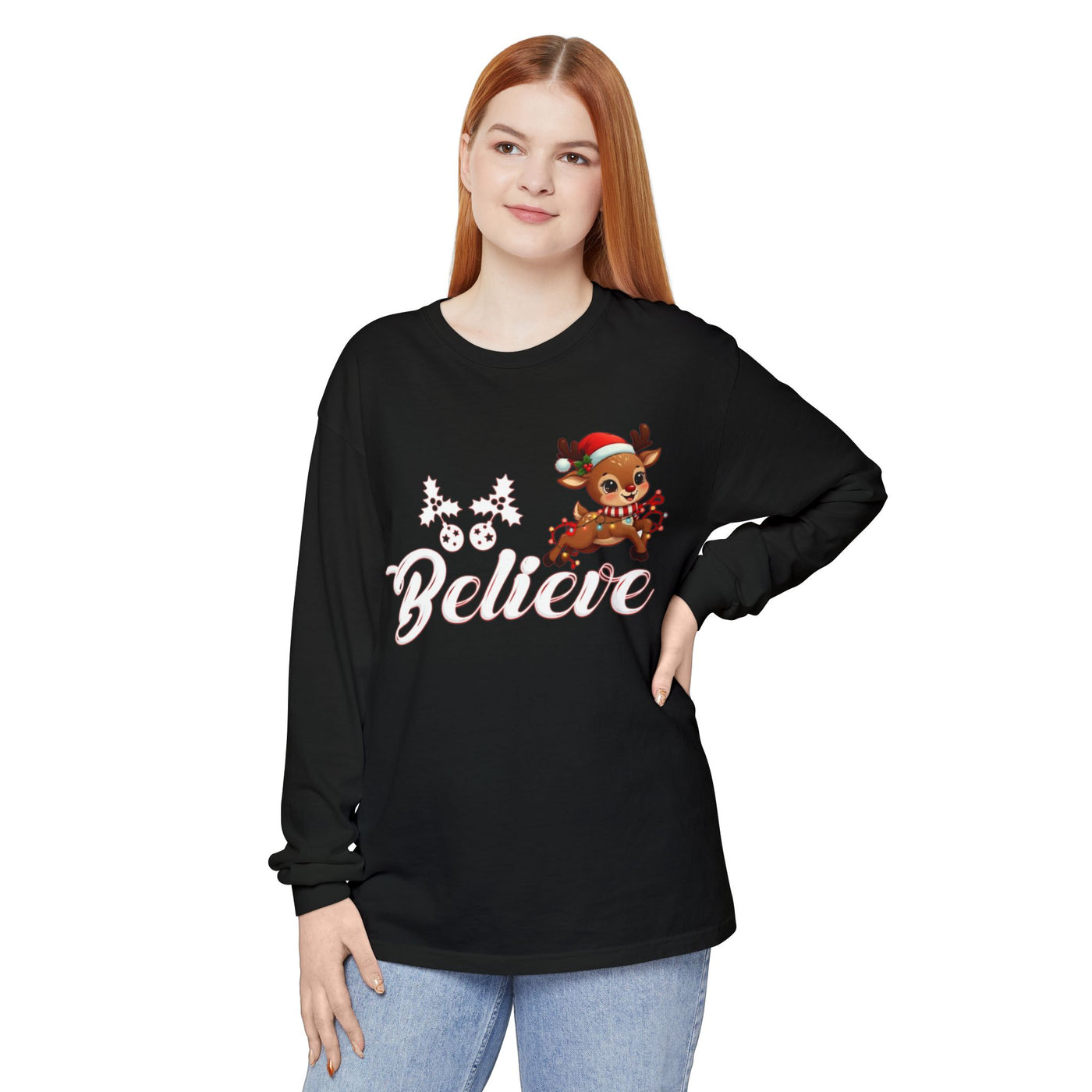 Soft, lived-in long sleeve with a quiet holiday charm. The garment-dyed cotton feels broken-in from the first wear, while the classic fit and ribbed cuffs keep the silhouette familiar and comfortable. A cheerful reindeer and playful “Believe” script sit on the chest, bringing a gentle, nostalgic note—like finding a hand-written card on a snowy morning. Wear it to slow down with hot cocoa, to wrap up errands on chilly afternoons, or to add subtle festive cheer to small holiday gatherings.