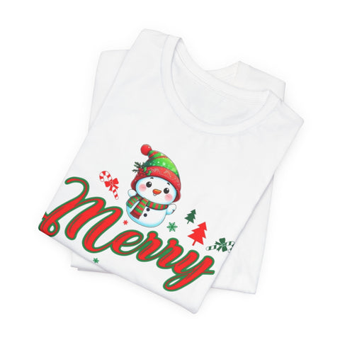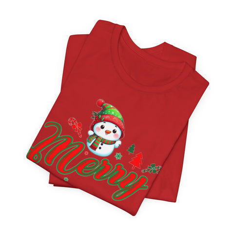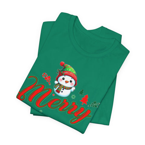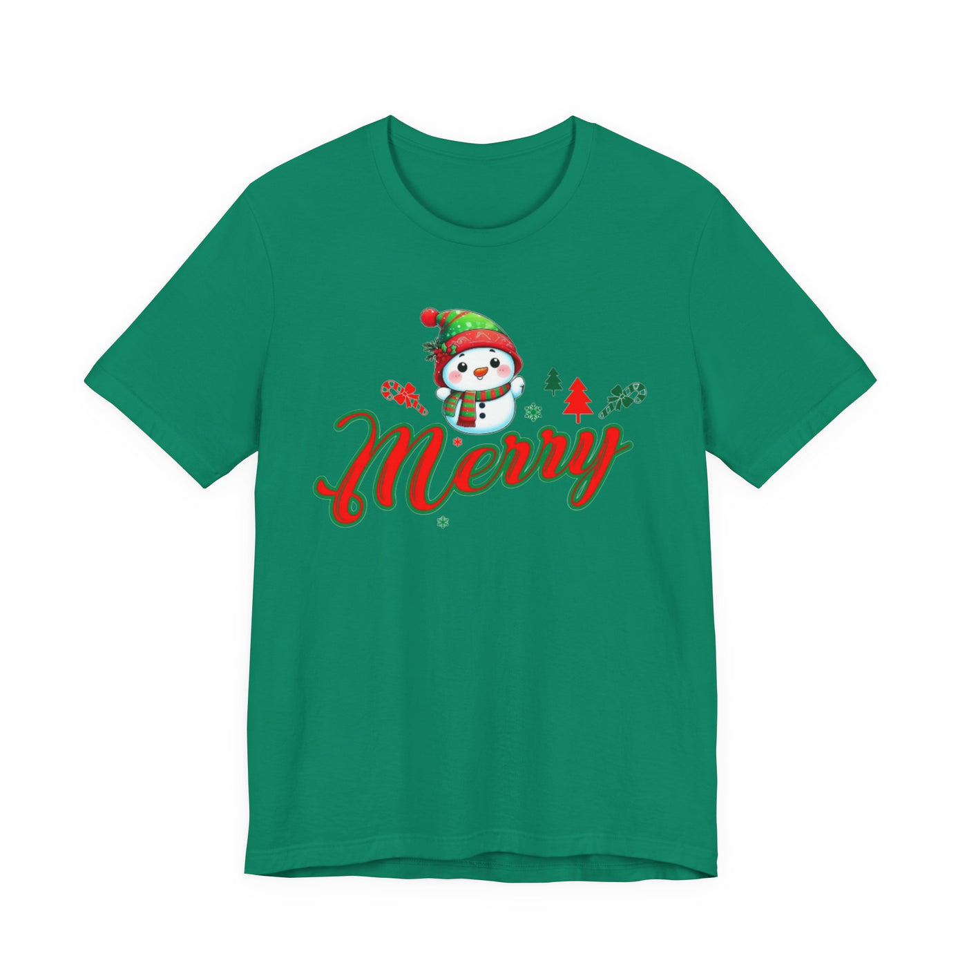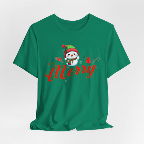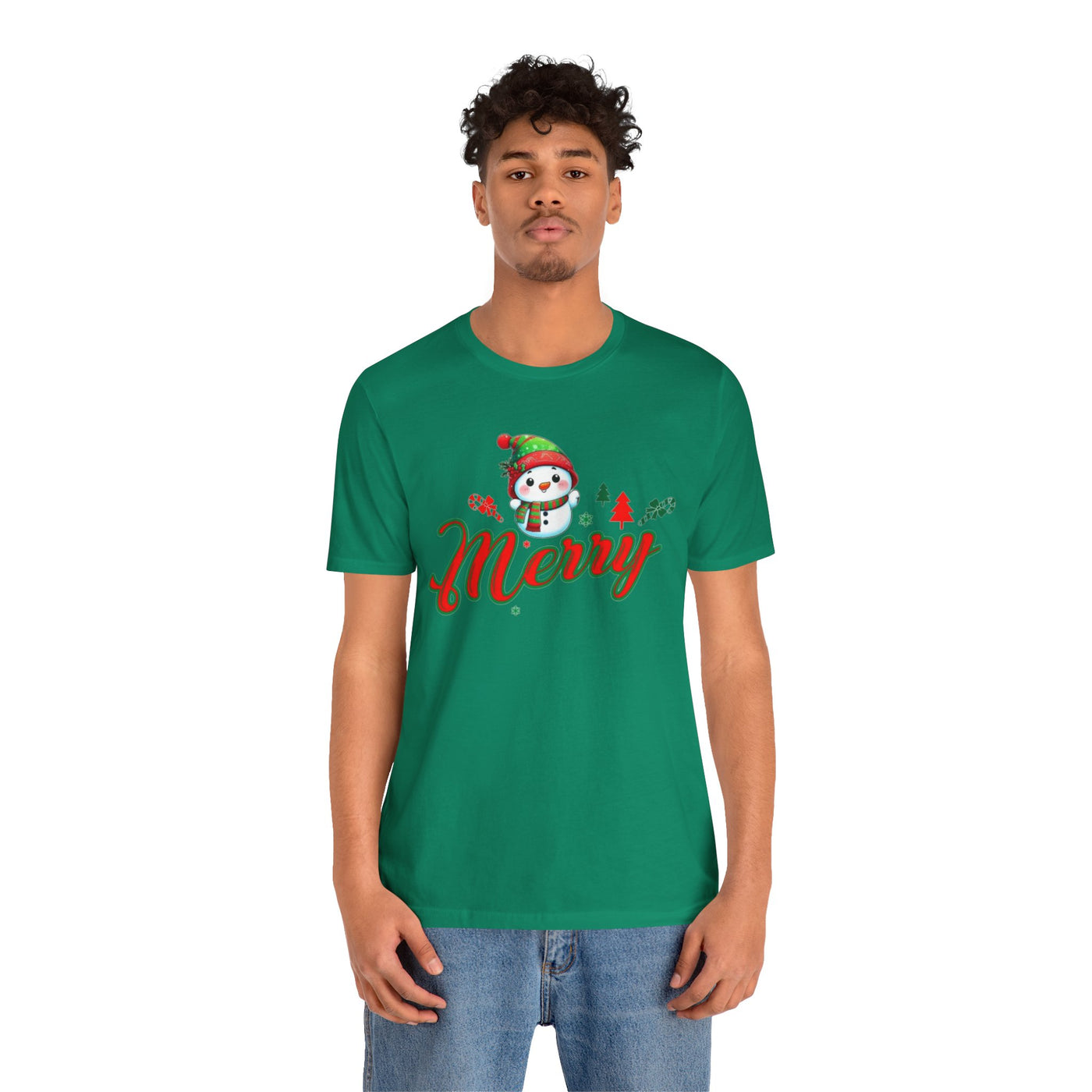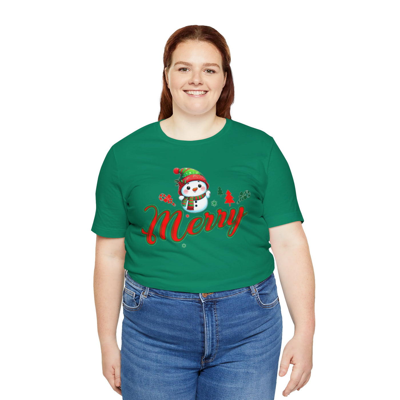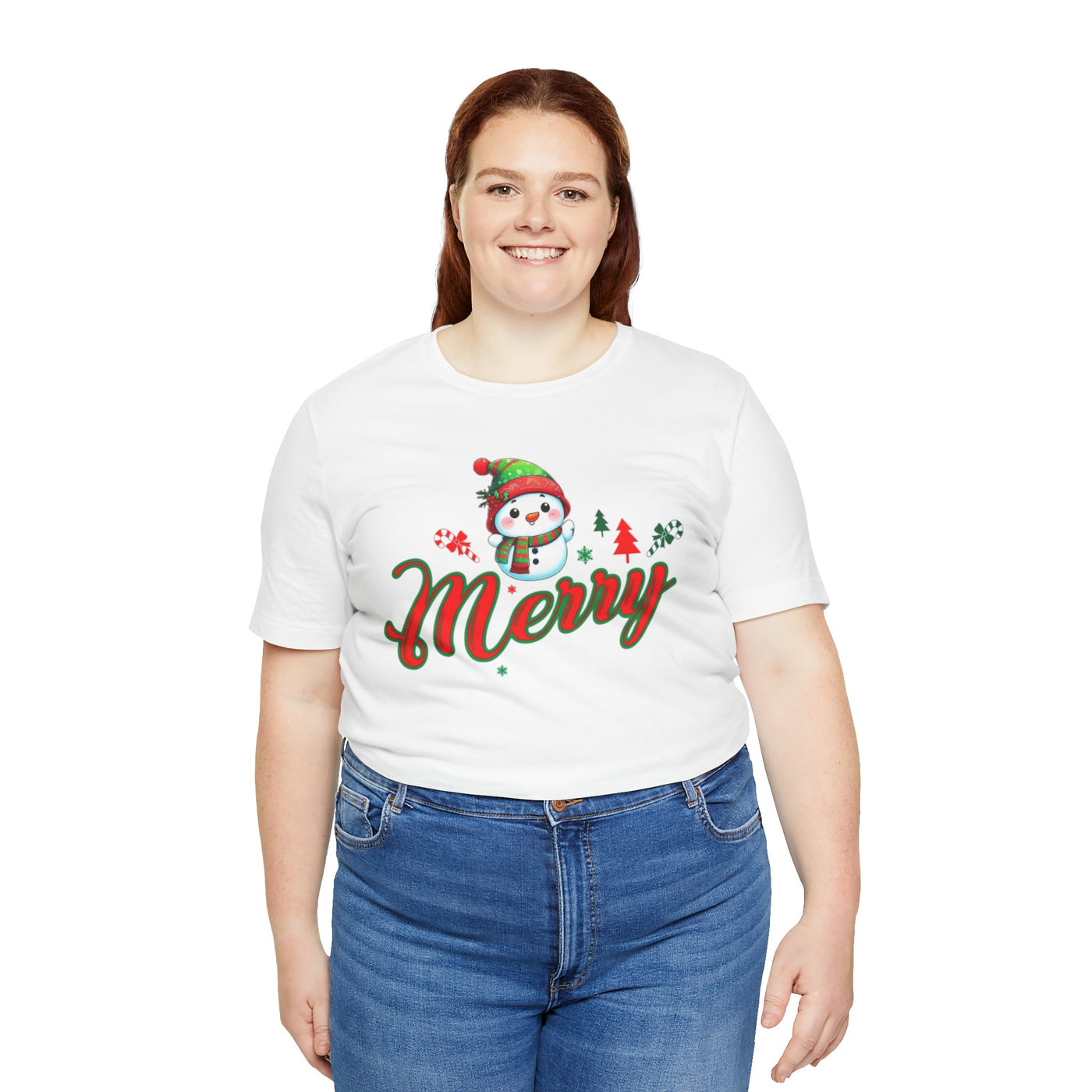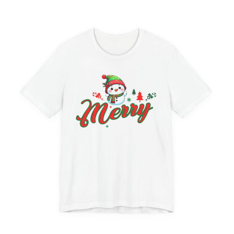 A soft, lightweight tee that carries a warm, festive mood. The cheerful snowman and hand-lettered “Merry” bring a gentle, nostalgic holiday feeling—like stepping into a quiet morning of stacked presents and cinnamon on the stove. The shirt sits comfortably at the shoulders and keeps its shape after many wears, so it becomes the go-to layer for cozy gatherings, cookie-baking sessions, or relaxed evenings by twinkle lights. Breathable cotton and a neat crew neckline make it easy to pair with a flannel, cardigan, or favorite jeans. Subtle details—clean sleeve printing, a tear-away label, and reinforced seams—mean it looks good and feels good all season long.